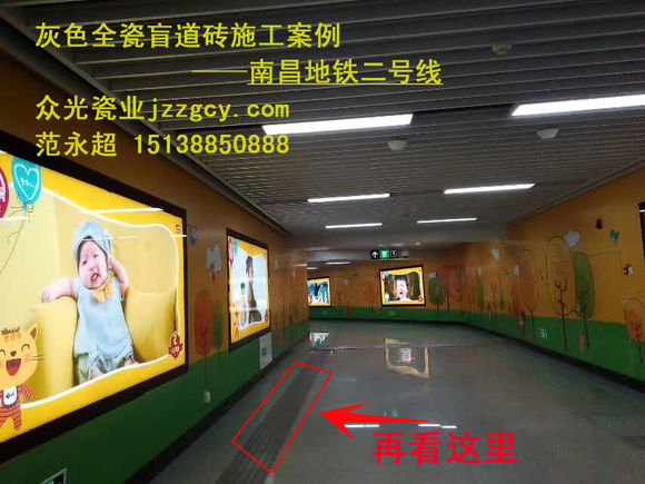 就在今天這個喜慶的日子里,激動人心的時刻到了,南昌地鐵二號線在經過建筑工人們近一年的艱苦奮戰,已于近日峻工完成,今天就是試運日,開通儀式將在地鐵大廈隆重舉行。該地鐵線路施工所使用的盲道磚均采用的是眾光灰色全瓷盲道磚,施工前期使用的大部分規格為400*400*20,后期有使用少量300*300*20的規格。眾光灰色全瓷盲道磚不只應用于南昌地鐵,北京地鐵、鄭州地鐵、武漢地鐵等國內許多城市的地鐵都采用的是眾光灰色全瓷盲道磚。眾光灰色全瓷盲道磚外觀大氣高雅,陶瓷材質防滑耐磨吸水率低,使用易清洗,是石材、塑膠、水泥、不銹鋼等材質不可比的。眾光盲道磚是按國家行業標準規定的盲道尺寸規格生產的,主要用于城市道路及火車站、汽車站、地鐵站臺、人行道上的鋪設,它是殘疾人指引行走無障礙的專用設施。